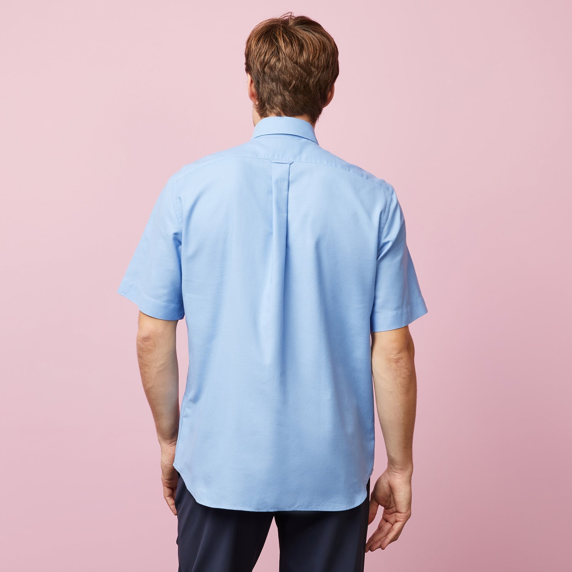 An essential classic. Plain, short-sleeved shirt in light blue. Timeless and fresh, made of quality cotton pique, it's breathable and comfortable especially for the warmer months. Simple smart-casual with jeans, chinos and shorts.