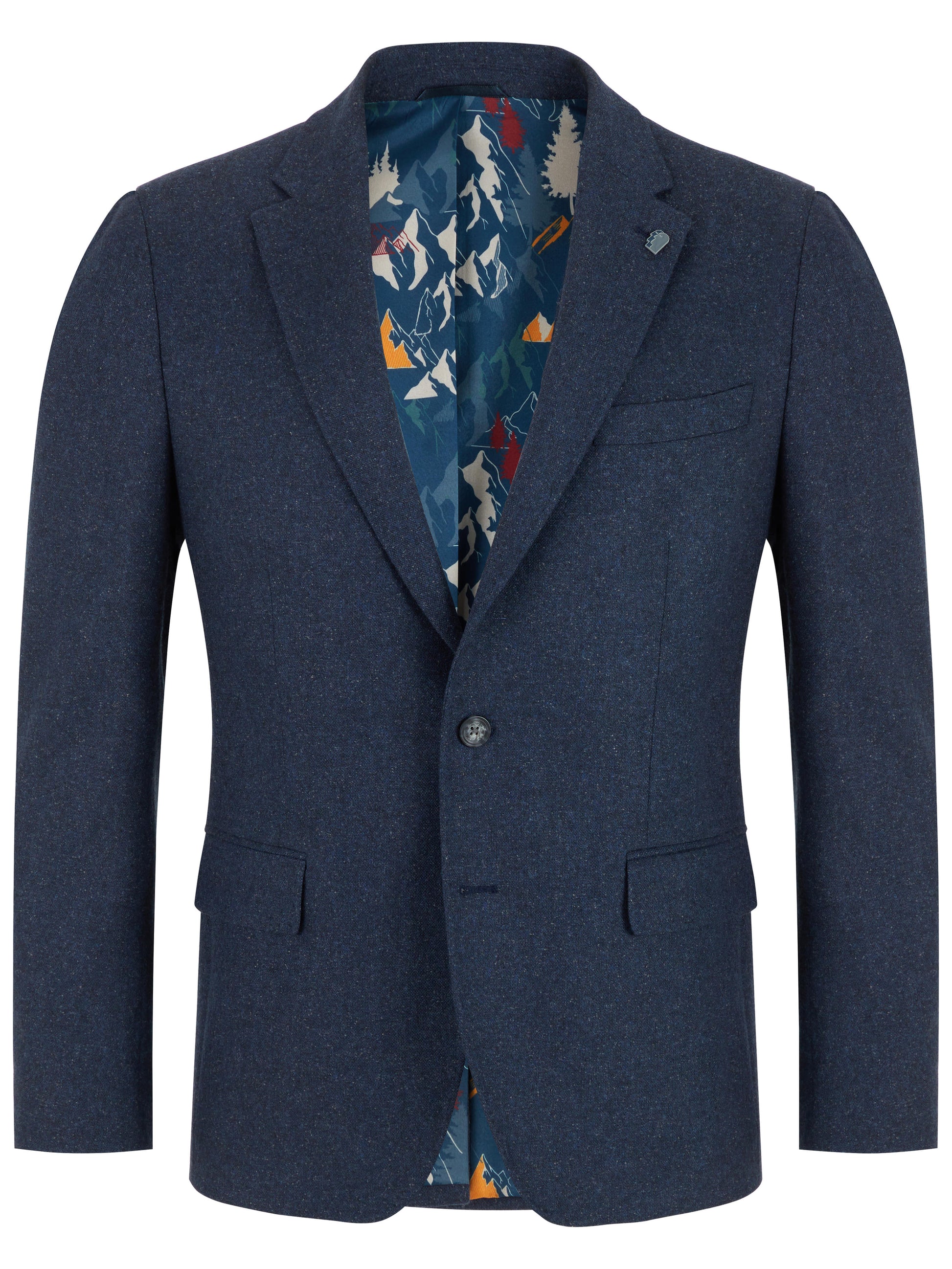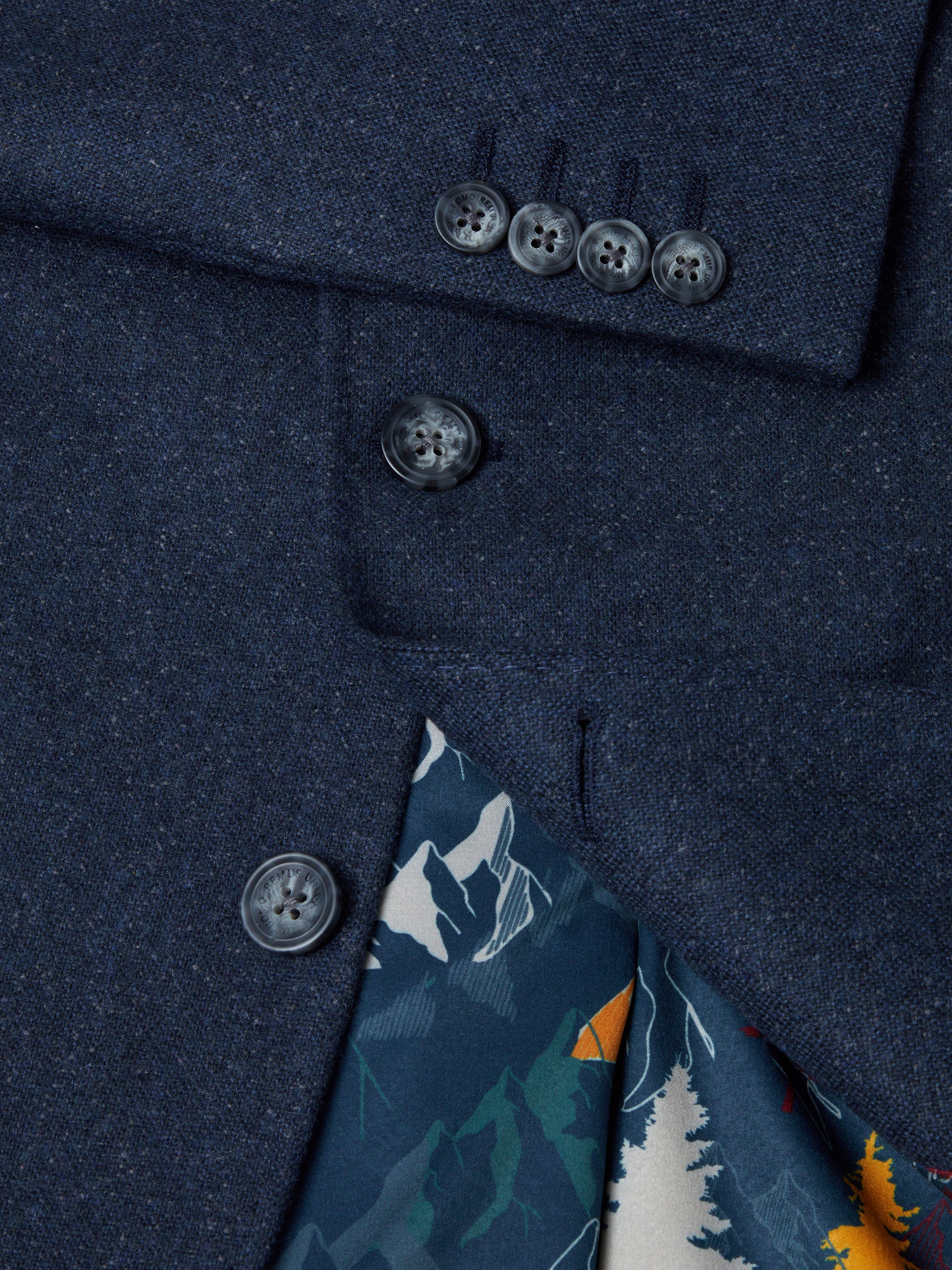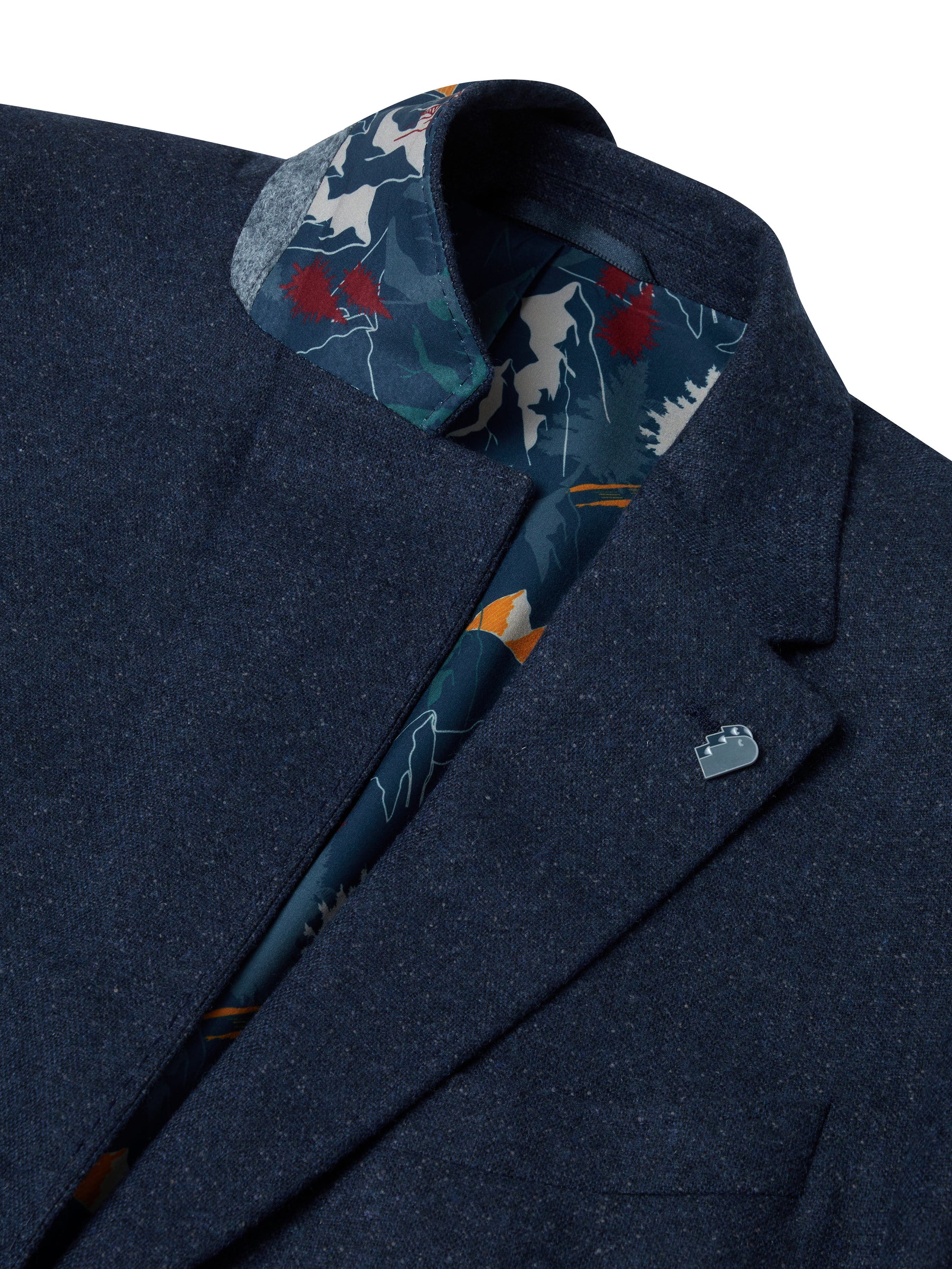 Dark navy blue slim-fit wool blend jacket with notched lapels. Single breasted, button two with straight flap side pockets and side vents.