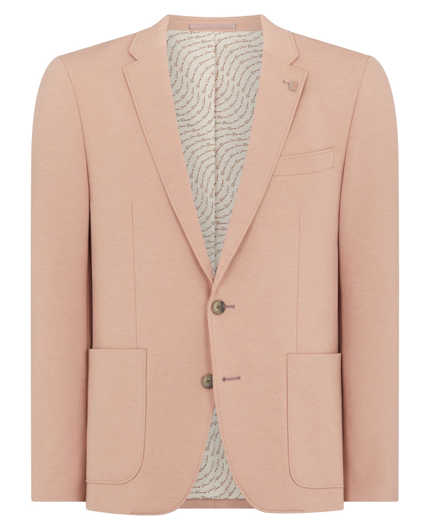 Light pink slim-fit nylon blend stretch jacket. Single breasted, button two with patch pockets and side vents.