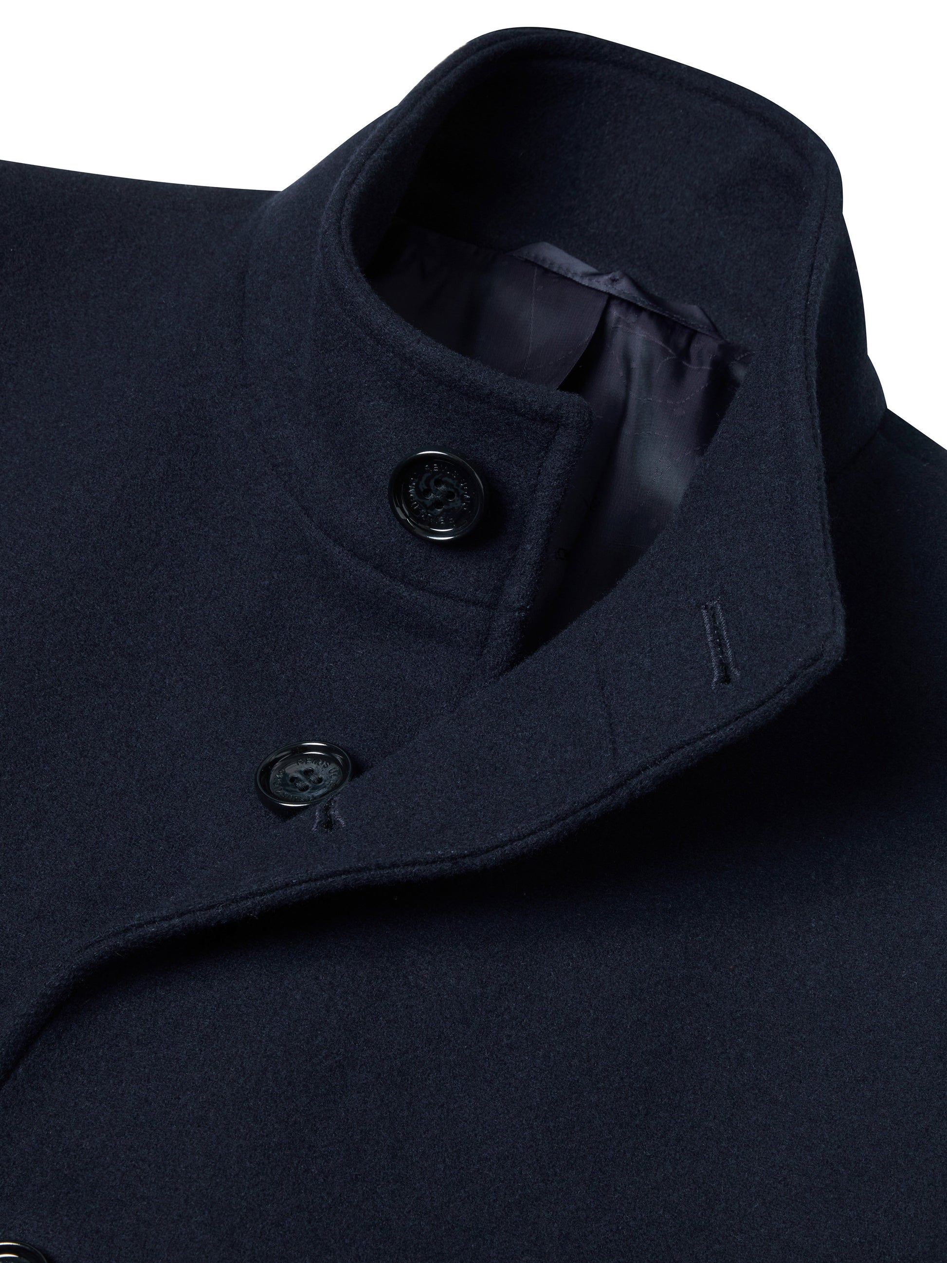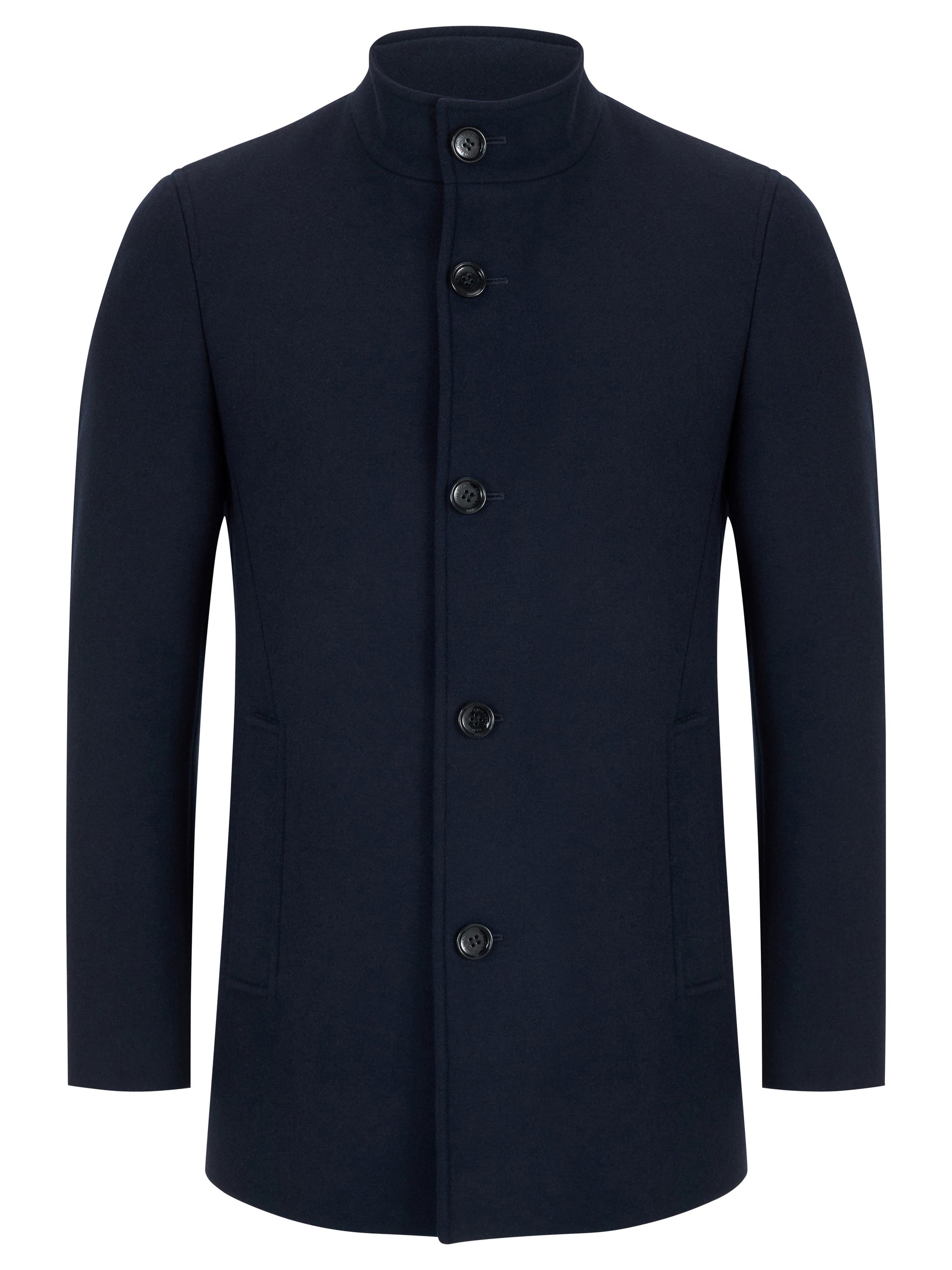 Navy tapered fit wool-blend tailored coat with stand collar.