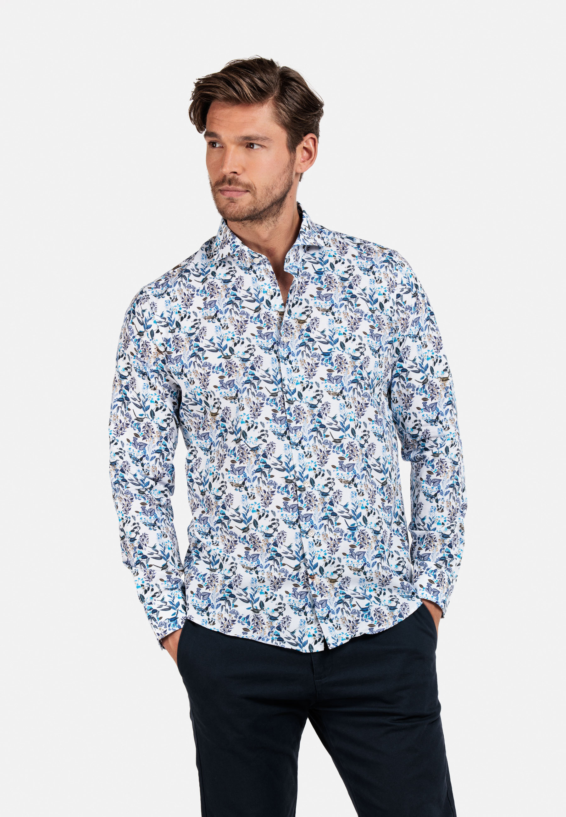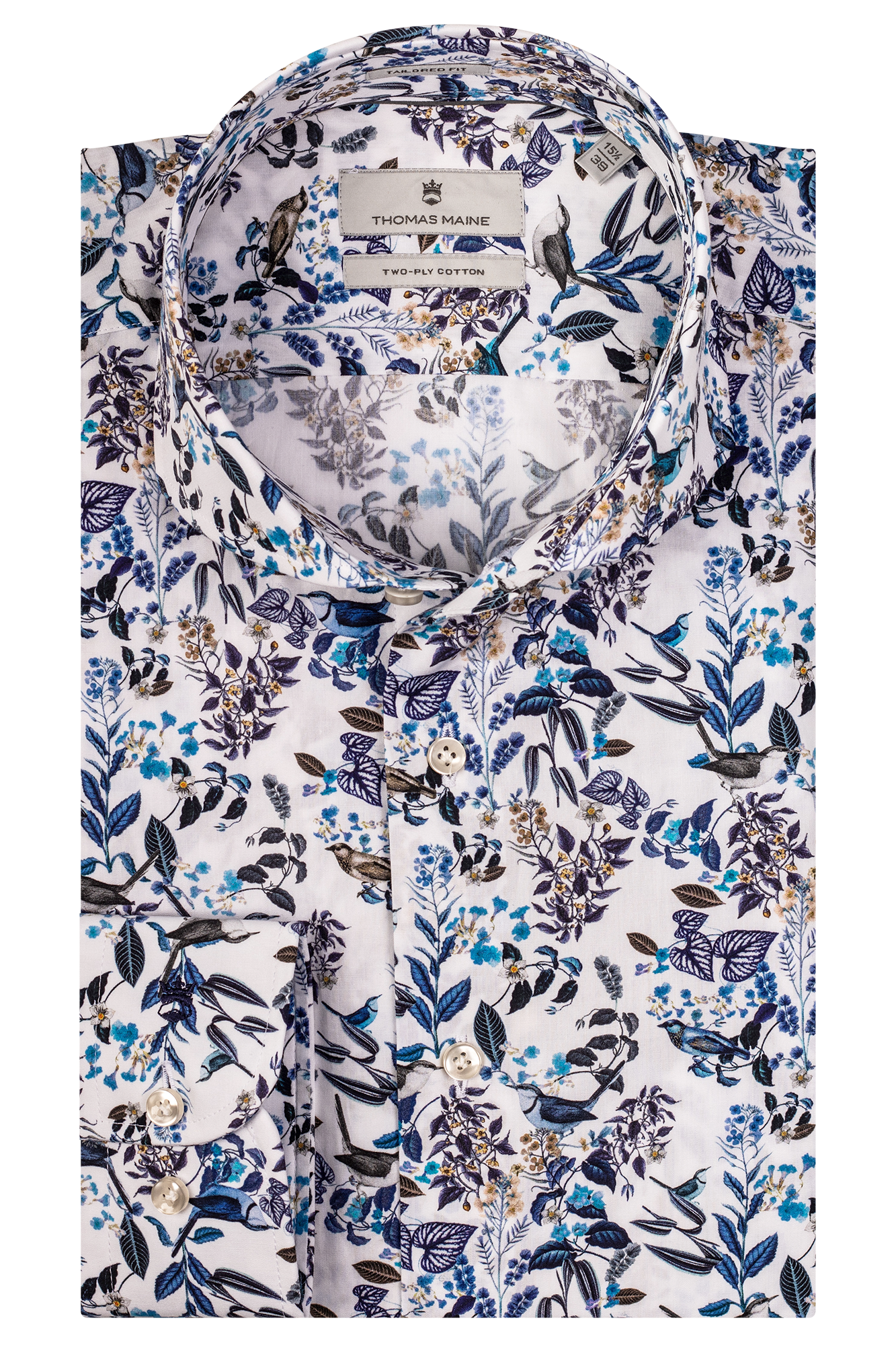 Luxury fine twill breathable cotton long sleeve shirt from THOMAS MAINE. Leaves and bird print. The attention to detail is immaculate.
