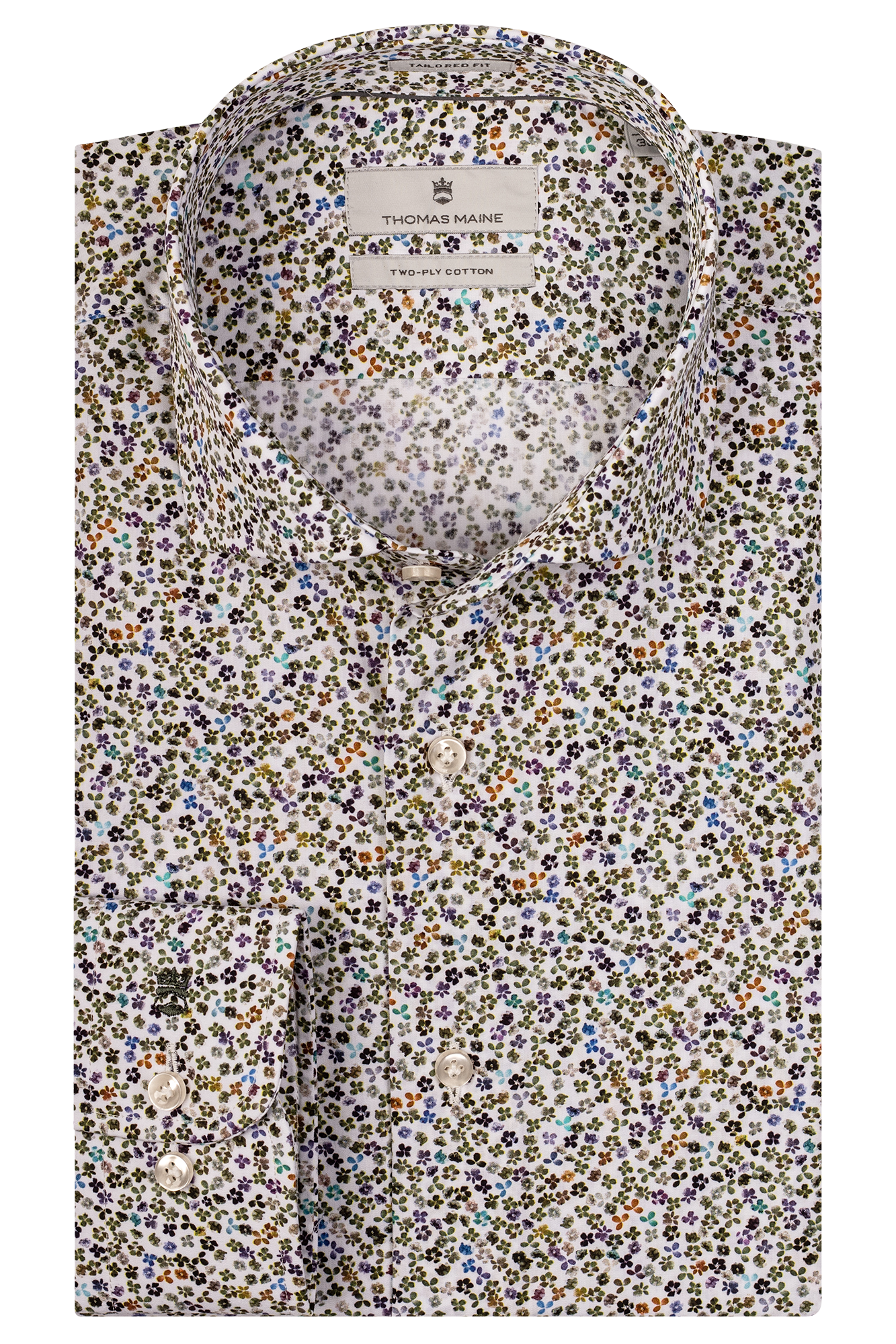 Luxury fine twill breathable cotton long sleeve shirt. White with subtle mini floral premium pattern. A breathable cotton shirt is crucial in your everyday smart-casual wardrobe and the attention to detail is second to none.